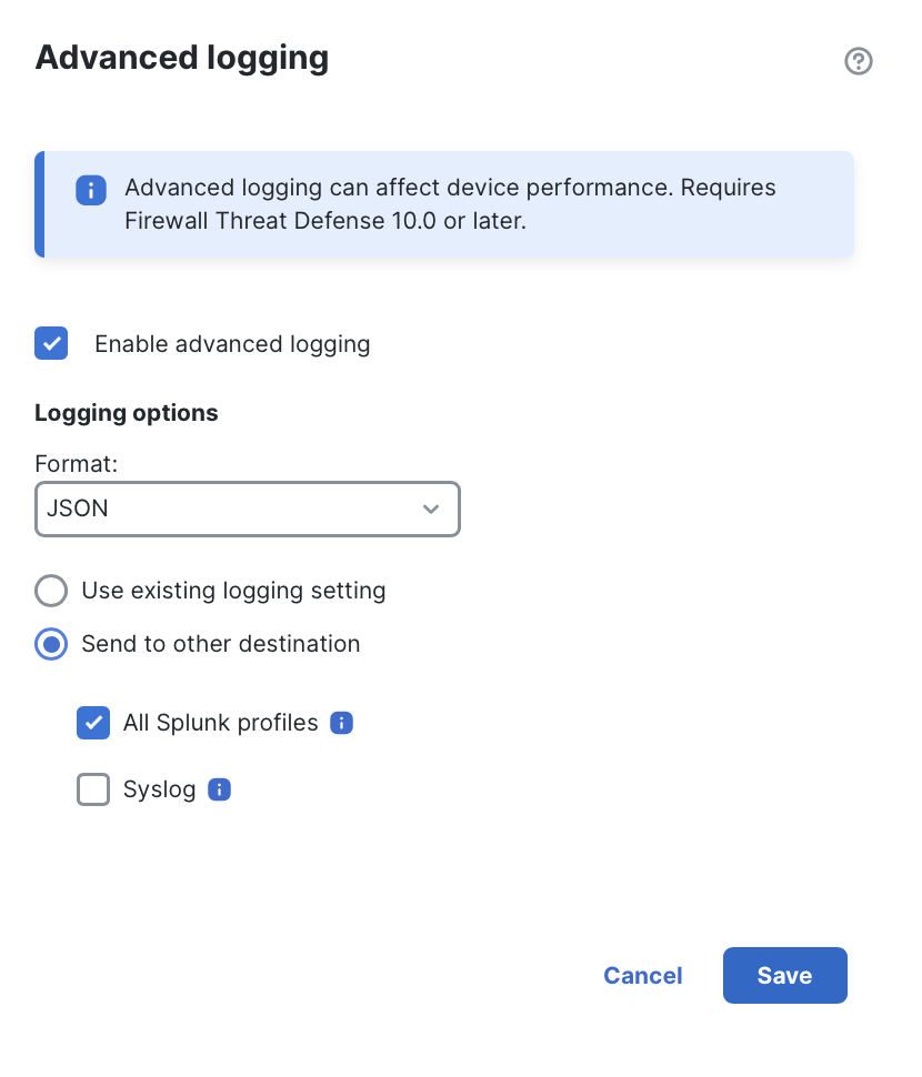 - Advanced logging is designed to be exported over syslog only. Sending advanced logging events to FMC or cdFMC is not supported. Ensure that a syslog destination (such as Splunk) is configured to receive the telemetry.